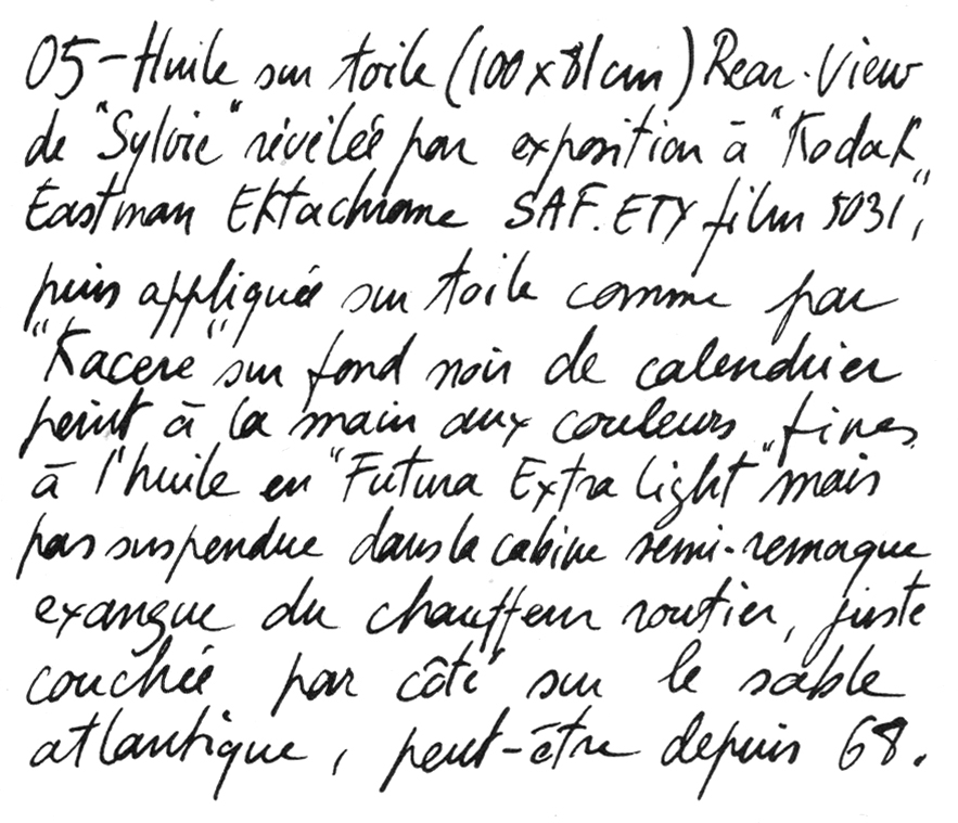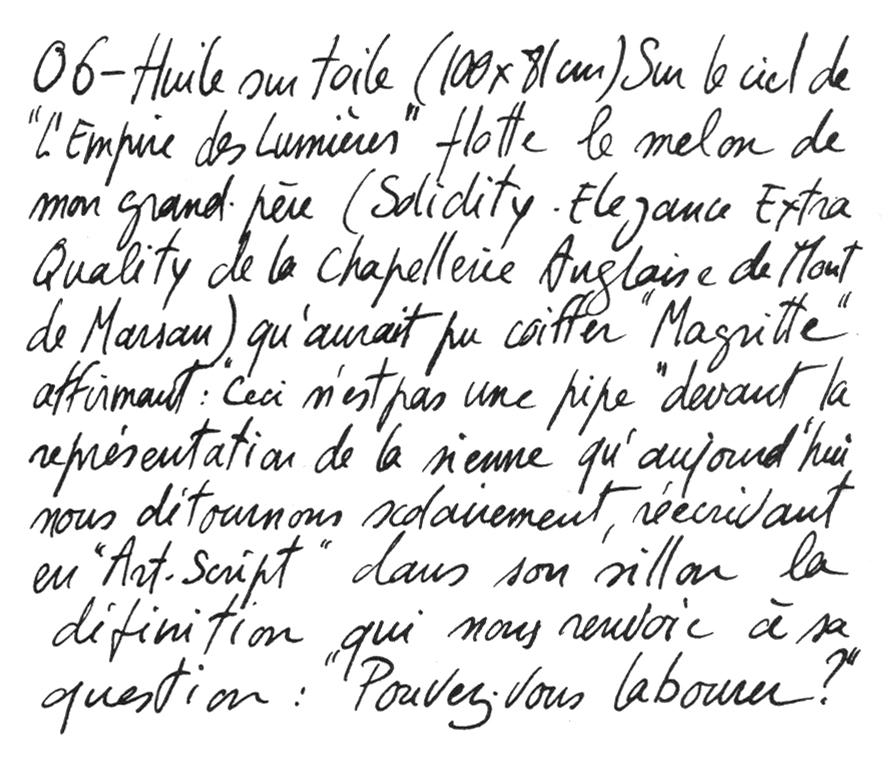 Ces toiles sont peintes à l’huile et chacune est accompagnée d’un cartel, d’une légende (l’appât de la signification) explicitant le sujet (l’analogie de la peinture doublée par l’analogie du titre) afin de préciser les sources et donner une piste de lecture.