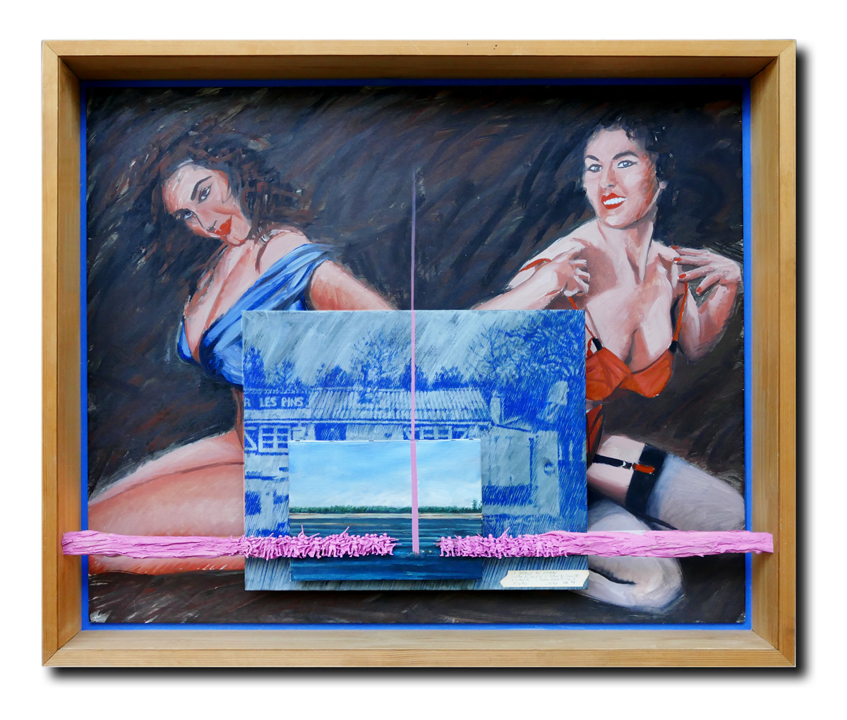 Entre Bazas et Roquefort dans les Landes l’armée américaine avait établi un très important camp militaire dans le cadre des accords internationaux liant les pays ayant mis fin aux exactions nazies en 1945. Tout le long de la route bordant ce camp s’était établi au lieu-dit LE POTEAU un ensemble de baraquements dont la vocation affichée était de servir de bordels de campagne. Ces établissements espacés tous les deux cent mètres environ étaient au nombre d’une douzaine, ils portaient des noms choisis parmi lesquels le Bar des Pins, le Bambi, l’Écrin, le Bilitis… En 1967 le Général de Gaulle pria les militaires américains de rentrer chez eux mais les bordels demeurèrent en activité. Ce n’est que vingt ans plus tard que furent définitivement clos puis détruits ces établissements. L’histoire qui me lie à ce lieu est faite des compréhensions successives que j’en ai eu. J’habitais Bordeaux et mes grands-parents dans le Gers, et la route qui m’amenait chez eux à chacune des vacances scolaires passait par LE POTEAU, ainsi le premier souvenir que j’en ai eu est celui-ci : soudain les conversations s’arrêtaient dans la voiture et les têtes se tournaient avec insistance vers la forêt en pointant une curiosité du paysage. La forêt (landaise) en question est d’une banalité absolue en face des bordels tous situés sur l’autre côté la route (la D 932). Lorsque je fus en âge de percevoir des signes plus explicites je compris qu’il se passait là des choses dont on ne pouvait pas parler librement, je surprenais les ouvriers agricoles tout comme les artisans voisins (parce qu’en famille le sujet n’était jamais abordé) dire de manière entendue qu’ils allaient au Poteau… Étrange destination qui me laissait interrogatif mais sans insistance sinon que le terme poteau déjà ambivalent était entouré d’une sorte de secret opaque s’augmentant du fait que lors de quelques passages, ayant jeté furtivement un regard de l’autre côté de la route, j’eus l’occasion d’apercevoir des sortes de buvettes avec en avant des jeunes-filles regardant passer les voitures un verre à la main. Je ne découvris le pot au rose qu’à l’adolescence et il est maintenant nécessaire de préciser d’où vient cette locution : au Couvent des Oiseaux les jeunes-filles pensionnaires avaient l’interdiction de se maquiller mais lorsque les religieuses trouvaient que l’une d’elles avait les pommettes un peu trop roses elles cherchaient le pot qui contenait le fard afin de le leur confisquer. C’est alors que j’appris aussi de la bouche de certains intéressés qu’outre ses activités d’accueil ordinaires les bordels recevaient moult troisièmes mi-temps de rugby, parties de chasse ou meetings politiques qui s’achevaient là. J’ai connu personnellement un plombier très impliqué dans l’entretien des sanitaires de ces lieux et un maçon qui faisait ses 120 kilomètres aller-retour en mobylette parfois de nuit. Toujours est-il que l’expression aller au Poteau était utilisée à soixante kilomètres à la ronde, chacun sachant parfaitement de quoi il retournait. Un matin de 1987 d’importantes forces de police entourèrent le lieu-dit, expulsèrent toute sa population et placèrent des scellés sur les établissements qui restèrent en l’état durant quelques mois avant d’être rasés. C’est à cette époque que j’eus l’occasion de pénétrer dans le Bar des Pins par les ouvertures arrières qui avaient été forcées. Je conserve de cette visite une belle émotion et surtout une documentation choisie dont je me suis servi pour inaugurer une série dont je ne conserve à ce jour que deux pièces : « LE PERSPECTEUR » et « LA BATAILLE DU POTEAU ROSE ». Le tableau en relief que j’ai intitulé « LA BATAILLE DU POTEAU ROSE » est composé de plans étagés qui figurent métaphoriquement les strates de compréhension que j’ai eu progressivement du phénomène. Les cariatides qui servent de fond ont été arrachées aux pages d’un Paris-Hollywood usagé et peintes sans délicatesse. Par devant, sur un carton à peindre (toilé), c’est une représentation en bleu d’un de ces établissement (intitulé le Bar des Pins) et par devant encore une petite toile représente ce qu’est devenu le paysage, labouré après la destruction des baraquements. Une trainée de peinture rose (en résine) ancrée sur les bords du cadre (en pin) traverse la mise en scène en partie basse et des soldats y sont agglomérés. Ils s’arrêtent face à face à l’endroit où un trait de peinture (qui se prolonge sur les divers plans) trace une sorte de poteau.